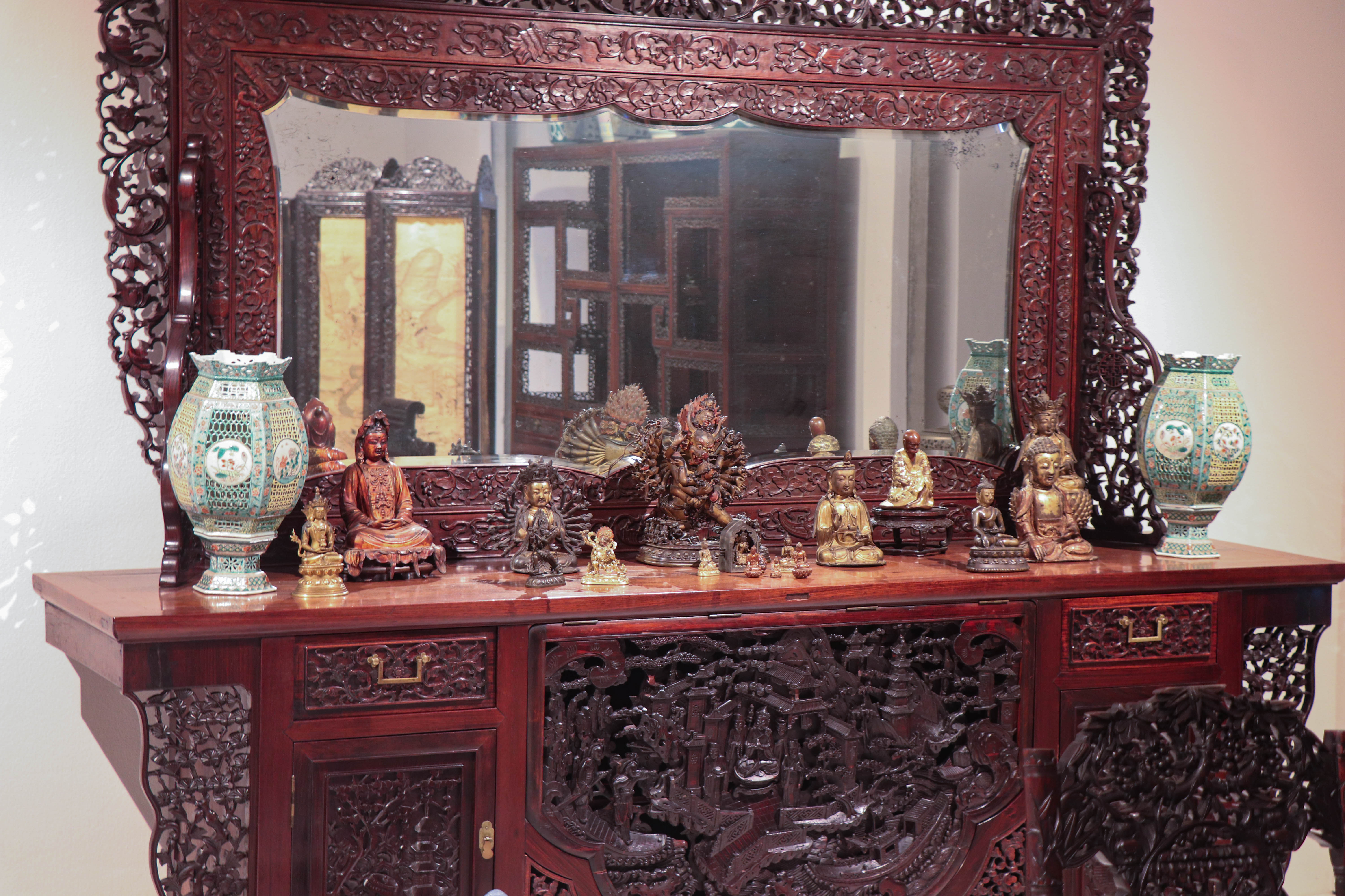When the couple exhibited some of their collection at the 1930 Ljubljana Grand Fair, it was again that configuration of dresser and Buddhist images which was displayed. It is well documented on photographs, one of which shows Tsuneko‘s daughter Erika dressed in an original Chinese costum playing the lute, probably taken at the Fair. (Kozicz, Luo, Frühwirt 2025: 97, fig. 4; cf. Berdajs 2021: 164, fig. 10) The figurines were certainly among the most impressive objects, but it seems that they were also of specific personal importance to Tsuneko. The mode of display and also the order of arangement, which remains widely unchanged through the years, suggest that they functioned as a personal reminder of her early life in Japan and China, or even more than that: a personal shrine.