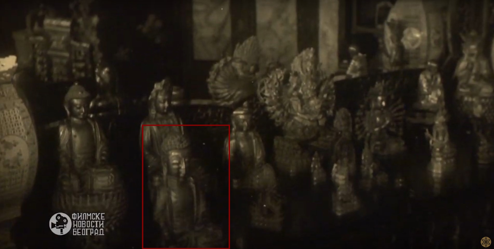 Buddha Statue on the Dresser within the Skušek apartment, Screenshot by Gerald Kozicz, Illustration by Max Frühwirt © Filmske novosti Beograd, 1957