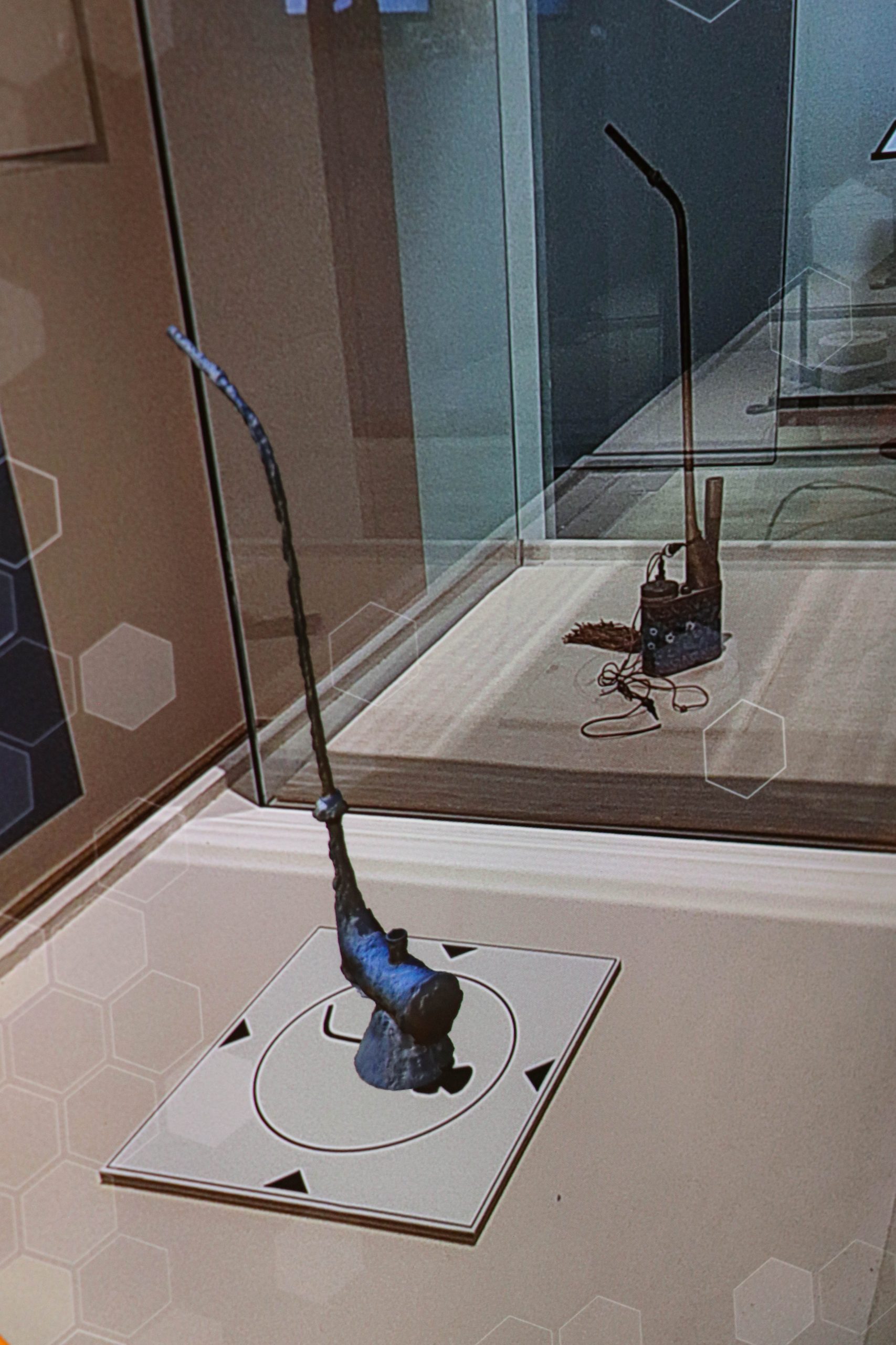 Both pipes, one physical and one digital, next to each other, reconnected via the virtual during the 2025 exhibition “Asia in the Heart of Ljubljana: The Life of the Skušek Collection” at the Slovene Ethnographic Museum, Photograph © Max Frühwirt 2025