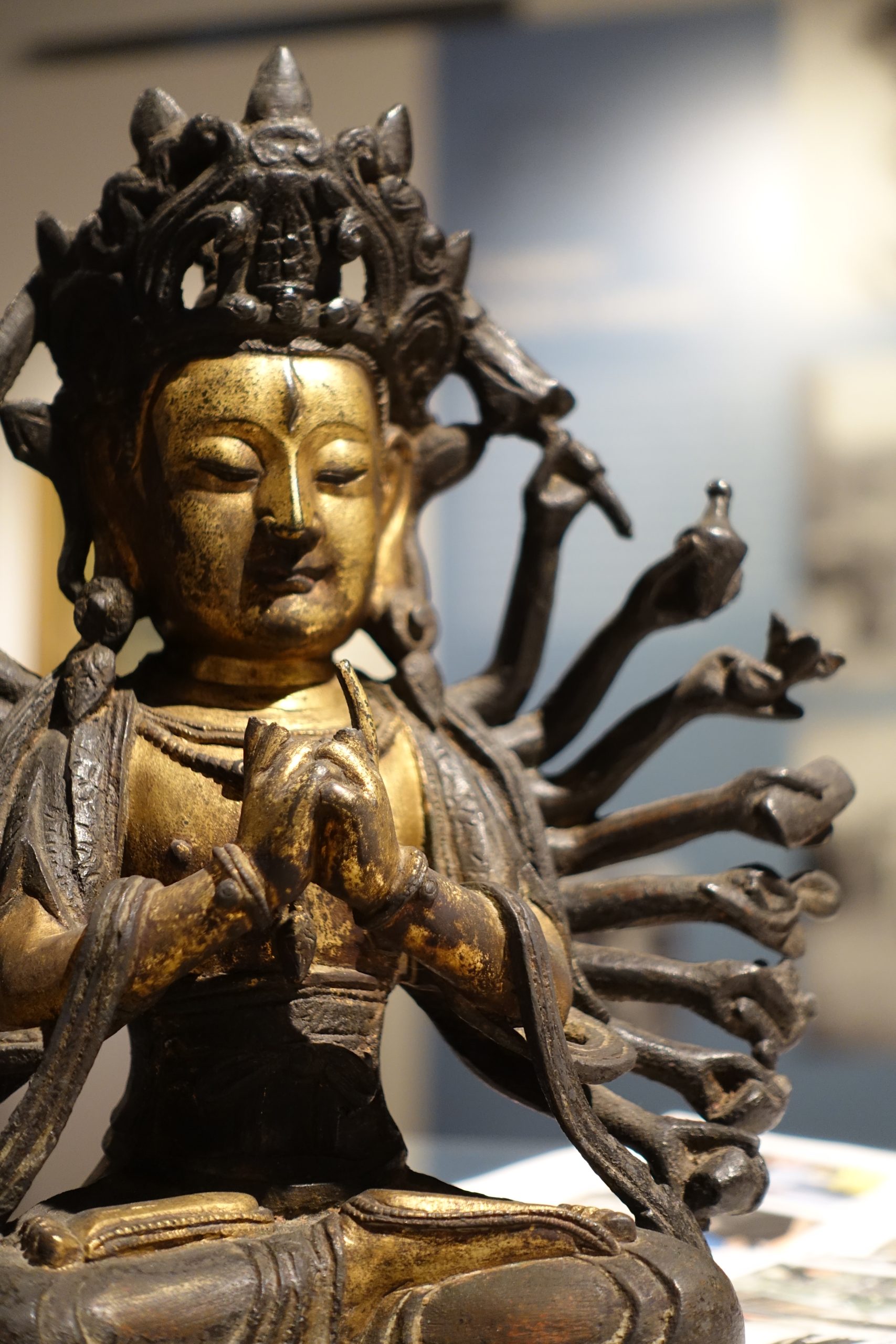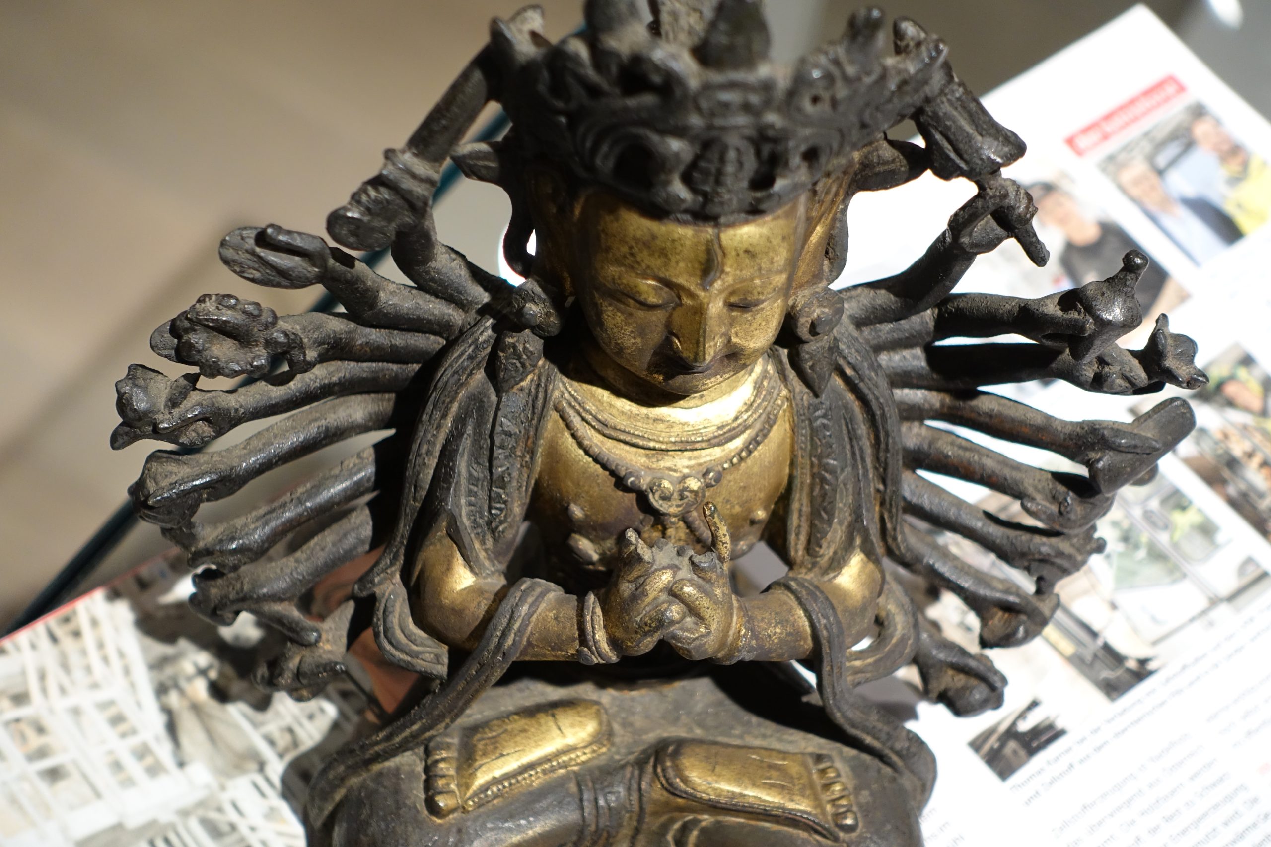 One of the enigmatic figures on the dresser in the Skušek‘s flat is an eighten-armed bronze in sitting posture with both legs crossed. Its pedestal is apparently gone. The figure was labelled as Kuanyin, that is, the Bodhisattva of Compassion Avalokiteśvara, in an early inventory list produced after the transfer of the collection to the SEM. The sculpture however, depicts the goddess Cundā (also Cundī). This “misidentification” is not unique as several almost identical sculptures across European museum collections are labelled as the male bodhisattva. In fact, nothing would hint at a female deity as no physical features display her feminine nature. Also, the central pair of hands displays a gesture that is almost identical with Avalokiteśvara‘s hands that hold the invisible wish-granting jewel in front of the chest.